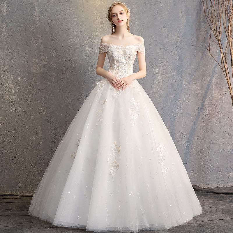 シンプルながらも洗練されたオフショルダーデザインのウエディングドレスです。