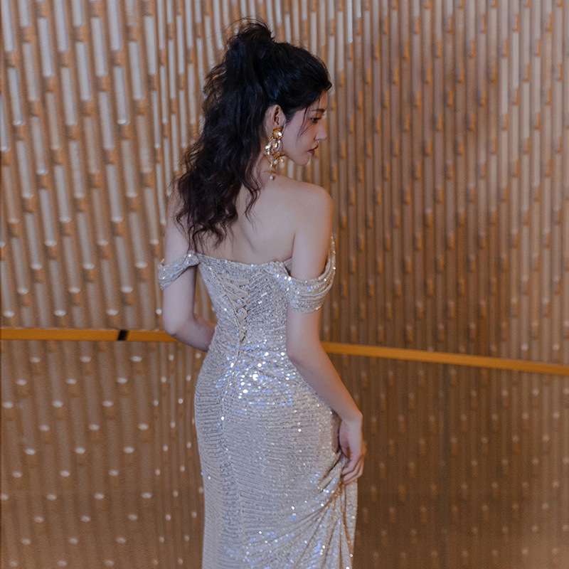 肩を美しく見せるオフショルダーカットが、華やかさとエレガントさを引き立てる