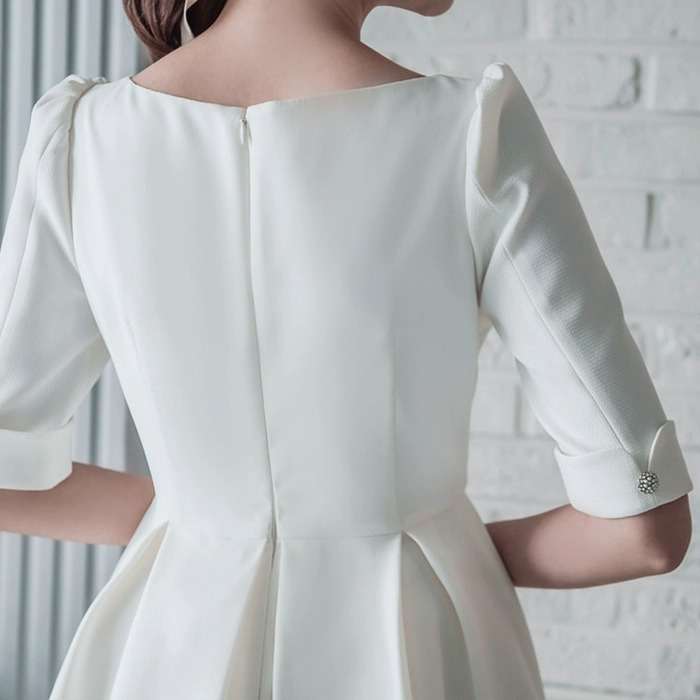 五分袖とスクエアネックラインが上品さを演出し、ふんわりとしたスカートが優雅な雰囲気を醸し出します。