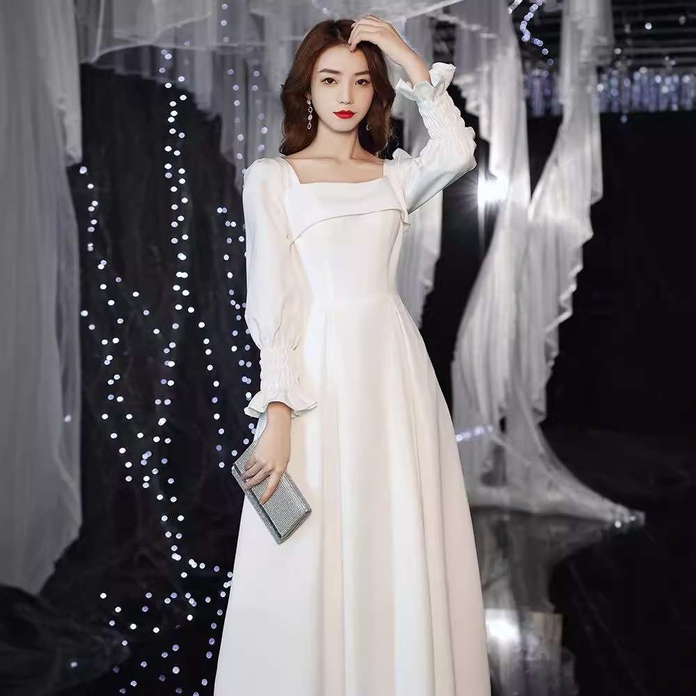 カラードレスの結婚式用/披露宴用のドレス。スクエアネックと長袖のパフスリーブが特徴的な優美なシルエット。