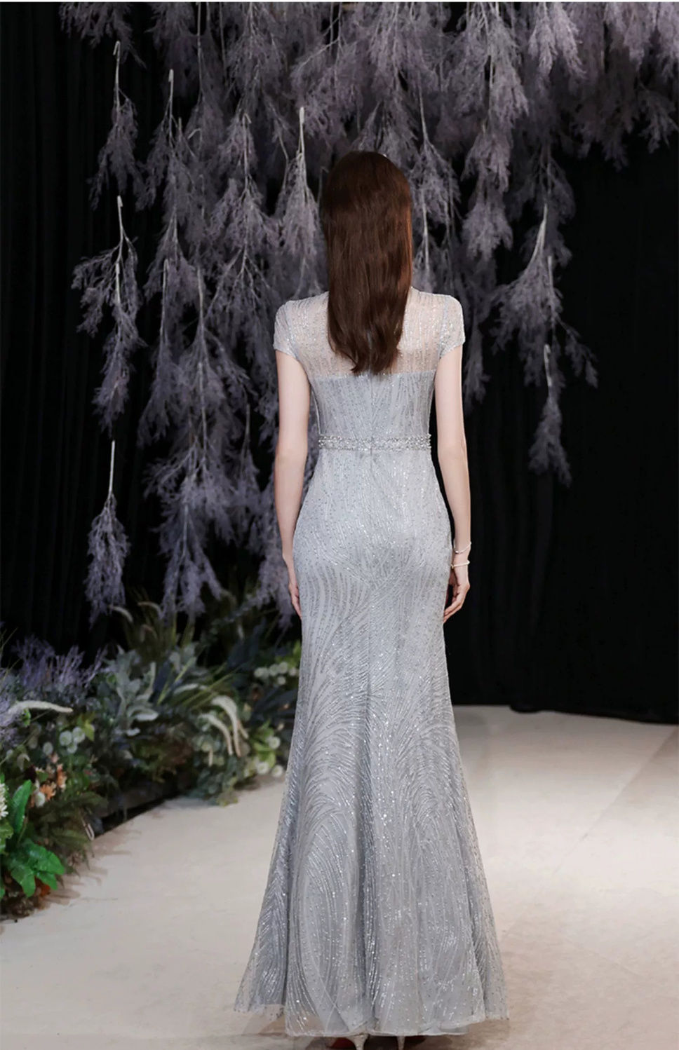 体のラインに沿った美しいマーメイドラインが、優雅で気品ある佇まいを引き立てます。