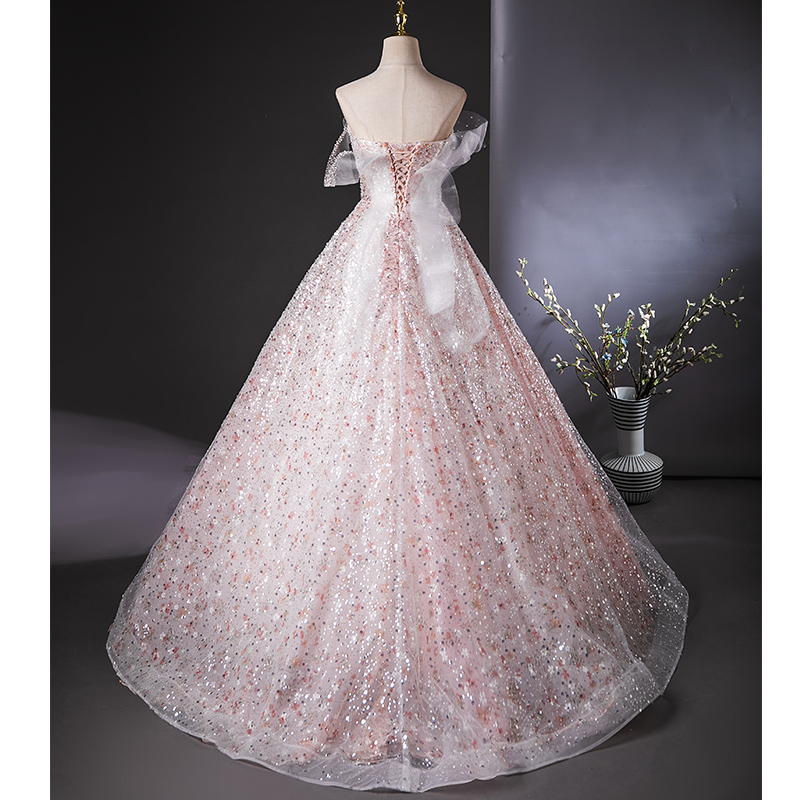 華やかなピンクのカラードレスは、特別な日のための完璧な一着。オフショルダーのデザインが優雅さを演出し、上品な印象を与えます。全体に施されたきらめく装飾は、まるで夜空に輝く星々のよう。Aラインシルエットは、花嫁様の美しさを引き立て、動くたびに魅了します。チュール素材の重なりが生む奥行きと柔らかさが、さらに特別感を添えます。ピンクのドレスで、最高の瞬間を彩りましょう。